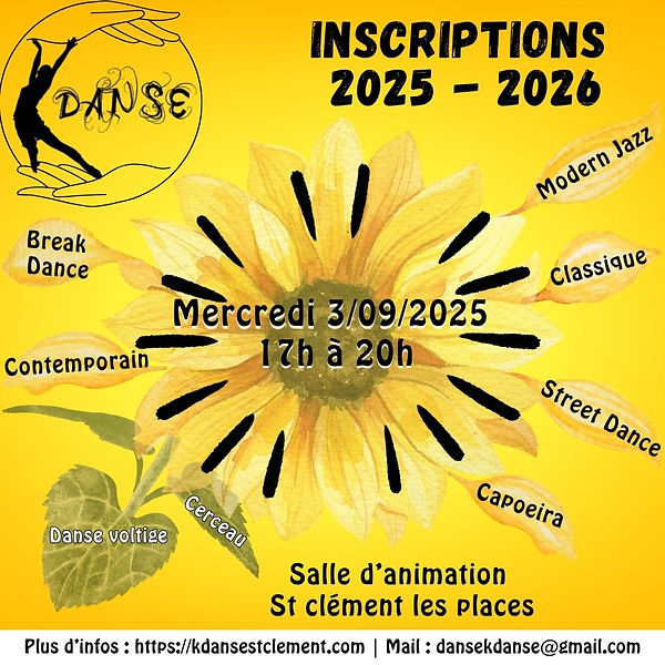Les inscriptions aux cours de danse pour les anciens et nouveaux danseurs sont confirmées au début de la saison suivante, le 1er mercredi de septembre, à la salle d'animations de Saint-Clément-les-Places.